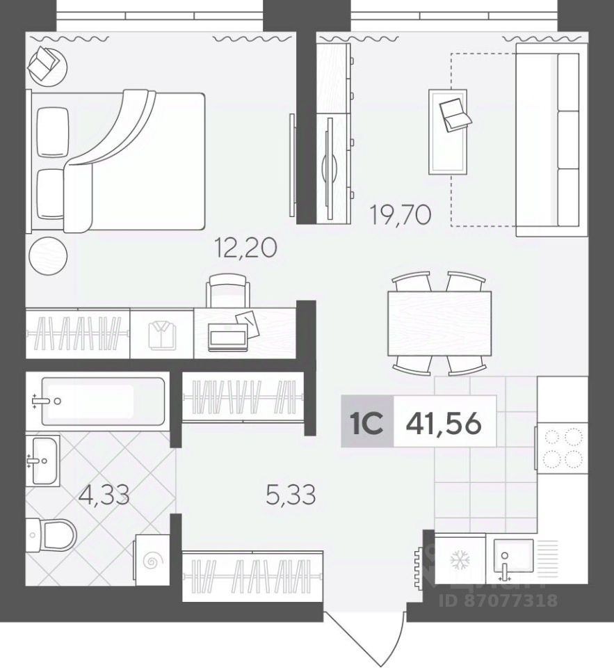 Продаётся 1-комнатная квартира в строящемся доме (ГП 2 (Сергея Корепанова, 34)), срок сдачи: IV-кв. 2027, общей площадью 41.56 кв.м., на 8 этаже. Новый жилой комплекс "Скандиа. Квартал у Леса" от Специализированного застройщика "СКАНДИА У ЛЕСА" расположен в г. Тюмень на ул. Бориса Прудаева.