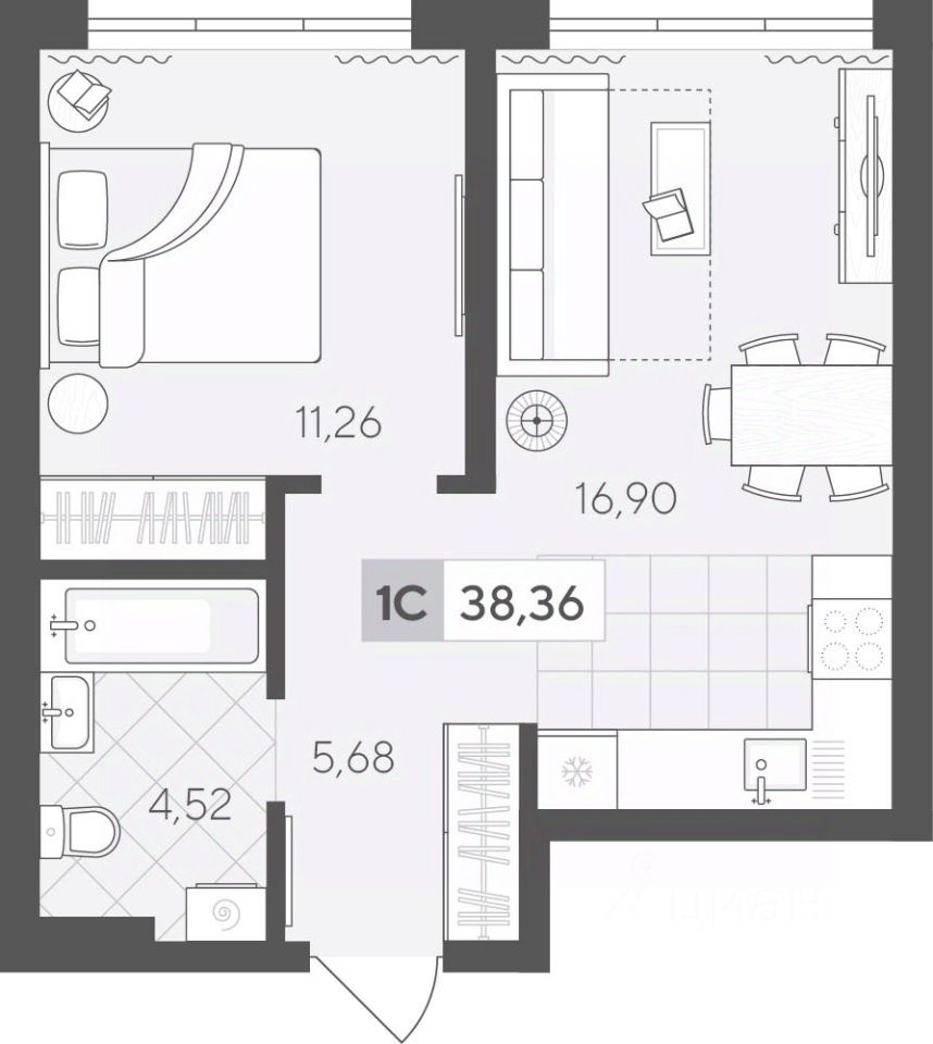 Продаётся 1-комнатная квартира в строящемся доме (ГП 2 (Сергея Корепанова, 34)), срок сдачи: IV-кв. 2027, общей площадью 38.36 кв.м., на 2 этаже. Новый жилой комплекс "Скандиа. Квартал у Леса" от Специализированного застройщика "СКАНДИА У ЛЕСА" расположен в г. Тюмень на ул. Бориса Прудаева.