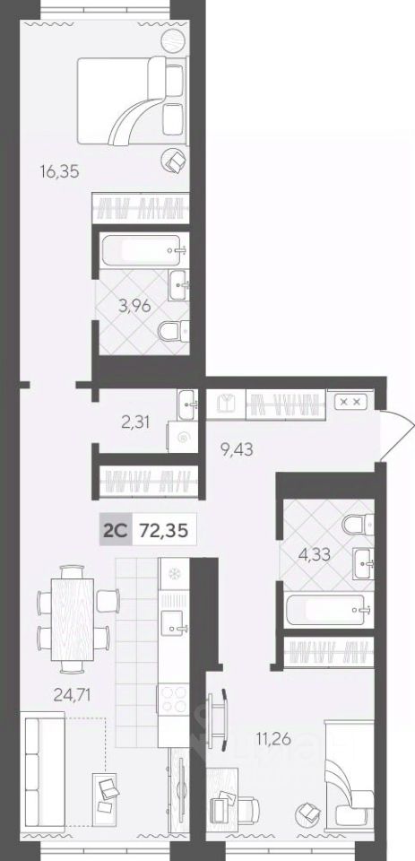 Продаётся 2-комнатная квартира в строящемся доме (ГП 2 (Сергея Корепанова, 34)), срок сдачи: IV-кв. 2027, общей площадью 72.35 кв.м., на 4 этаже. Новый жилой комплекс "Скандиа. Квартал у Леса" от Специализированного застройщика "СКАНДИА У ЛЕСА" расположен в г. Тюмень на ул. Бориса Прудаева.