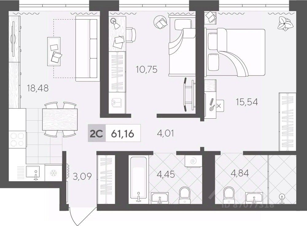 Продаётся 2-комнатная квартира в строящемся доме (ГП 2 (Сергея Корепанова, 34)), срок сдачи: IV-кв. 2027, общей площадью 61.16 кв.м., на 2 этаже. Новый жилой комплекс "Скандиа. Квартал у Леса" от Специализированного застройщика "СКАНДИА У ЛЕСА" расположен в г. Тюмень на ул. Бориса Прудаева.