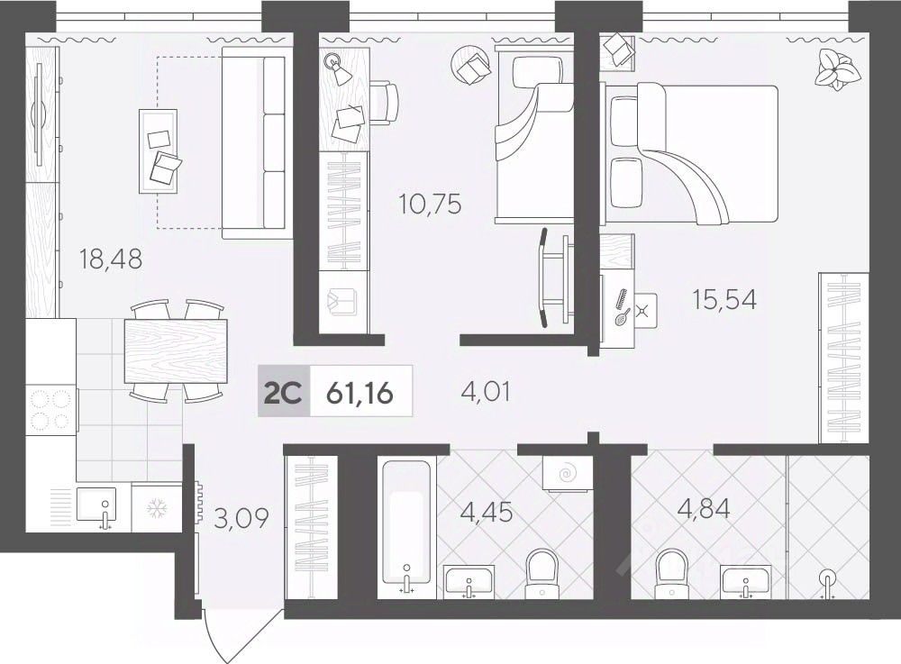 Продаётся 2-комнатная квартира в строящемся доме (ГП 2 (Сергея Корепанова, 34)), срок сдачи: IV-кв. 2027, общей площадью 61.16 кв.м., на 9 этаже. Новый жилой комплекс "Скандиа. Квартал у Леса" от Специализированного застройщика "СКАНДИА У ЛЕСА" расположен в г. Тюмень на ул. Бориса Прудаева.