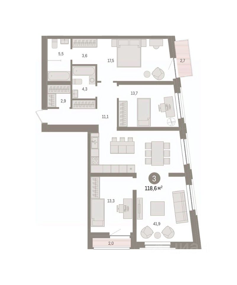 Квартира с кухней-гостиной и тремя спальнями в жилом районе "Речной порт". Особенности планировки: гардеробная, лоджия, разнесённые спальни, предчистовая отделка, мастер-спальня, балкон.