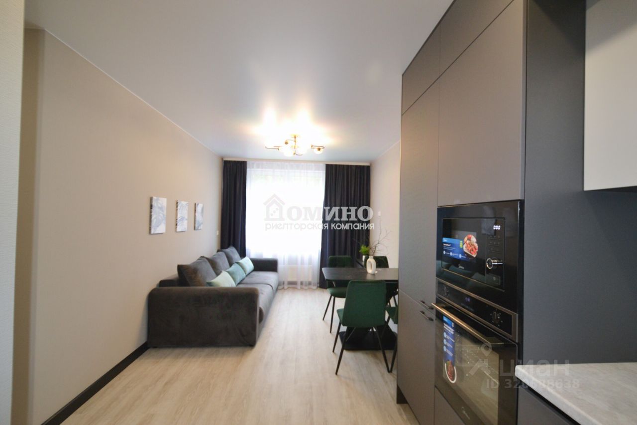 Просторная кухня-гостиная уже укомплектована на 100%. Кухонный гарнитур с полным комплектом встроенной техники - холодильник, посудомоечная машина, духовой шкаф, микроволновка, варочная поверхность и вытяжка, красивый обеденный стол с мягкими стульями, стильный диван и тв-тумба.