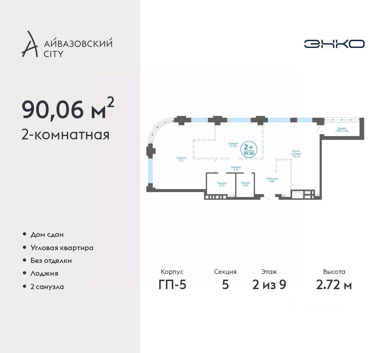 Продается двухкомнатная квартира в ЖК "Айвазовский City" на 2 этаже. Квартира без отделки, после выдачи ключей можно делать ремонт. Общая площадь: 90.06 кв.м., жилая: 42.88 кв.м., площадь просторной кухни-столовой: 23.18 кв.м. Угловая квартира, идеально подойдет любителям тишины и панорамных видов. В квартире одна лоджия, два совмещенных санузла. Высота потолков 2.72 м.