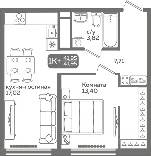Прямая продажа от застройщика! Продается однокомнатная квартира в строящемся ЖК "Меридиан Слобода", срок сдачи: I-кв. 2027, общей площадью 41.95 м², на 8 этаже из 21. Площадь кухни — 17.02 м².