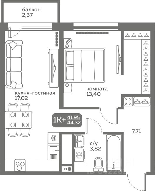 Прямая продажа от застройщика! Продается однокомнатная квартира в строящемся ЖК "Меридиан Слобода", срок сдачи: I-кв. 2027, общей площадью 41.95 м², на 5 этаже из 20. Площадь кухни — 17.02 м².