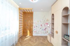 Детская комната оборудована удобной системой хранения, шведской стенкой и даже мини-скалодромом для активных игр. В просторной спальне предусмотрена гардеробная, а в кабинете скрытые шкафы и стильный рабочий стол. Особого внимания заслуживают две ванные комнаты: одна с душевой кабиной, вторая с роскошной отдельностоящей ванной, где можно расслабиться после долгого дня. Дополнительный комфорт обеспечивает отдельная постирочная с раковиной.