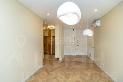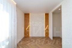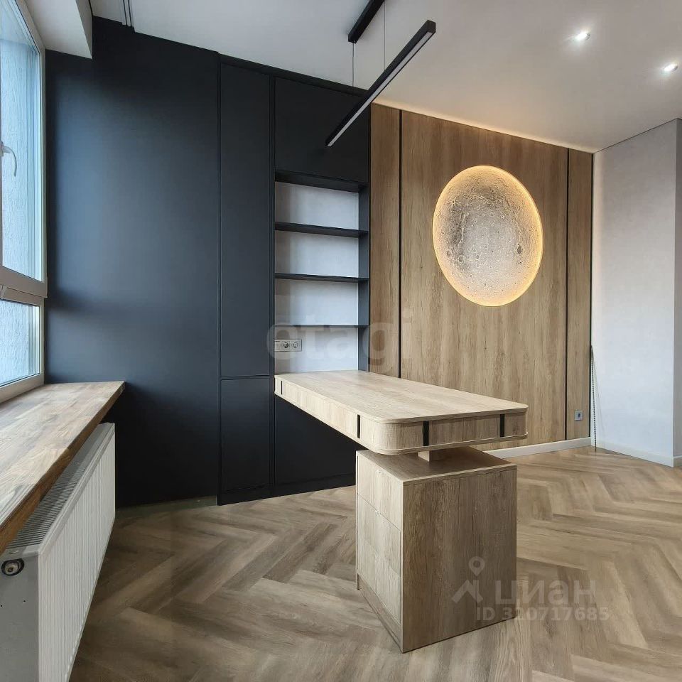 В жилых комнатах уложен кварц-винил благородной "ёлочкой", а кухня, прихожая, санузлы и кладовая покрыты керамогранитом с подогревом для максимального комфорта. Стены украшает декоративная штукатурка, дополненная натуральными дубовыми панелями и массивными подоконниками, создающими атмосферу эко-стиля. В гостиной и кухне использован топовый цвет 2025 года, а кабинет декорирован изысканным элементом в виде "луны" символа гармонии и изобилия. Встроенная LED-подсветка мягко подсвечивает интерьер, подчеркивая его глубину и элегантность.