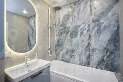 На полу ламинат 33 класса, натяжные потолки, на стенах обои/покраска, санузел выполнен в широкоформатном керамограните, вся сантехника из качественного материала. Унитаз-инсталляция, тумба-раковина, под стиральную машинку(разводка выведена), зеркало с подсветкой, электрический полотенцесушитель.
