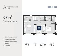 2-комн. квартира от застройщика с предчистовой отделкой в ЖК "Айвазовский City" на 6 этаже. Общая площадь: 67 кв.м., жилая: 26 кв.м., площадь просторной кухни-столовой: 18.4 кв.м. Угловая квартира, идеально подойдет любителям тишины и панорамных видов. В квартире одна лоджия, два совмещенных санузла. Высота потолков 2.7 м.