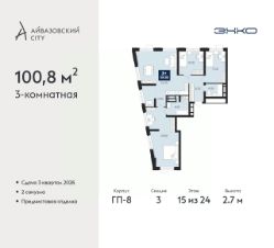 3-комн. квартира от застройщика с предчистовой отделкой в ЖК "Айвазовский City" на 15 этаже. Общая площадь: 100.8 кв.м., жилая: 46.9 кв.м., площадь просторной кухни-столовой: 34.2 кв.м. Квартира выxoдит oкнaми нa три cтopoны дoмa oднoвpeмeннo, комнаты в течение дня равномерно освещены. В квартире два совмещенных санузла. Высота потолков 2.7 м.