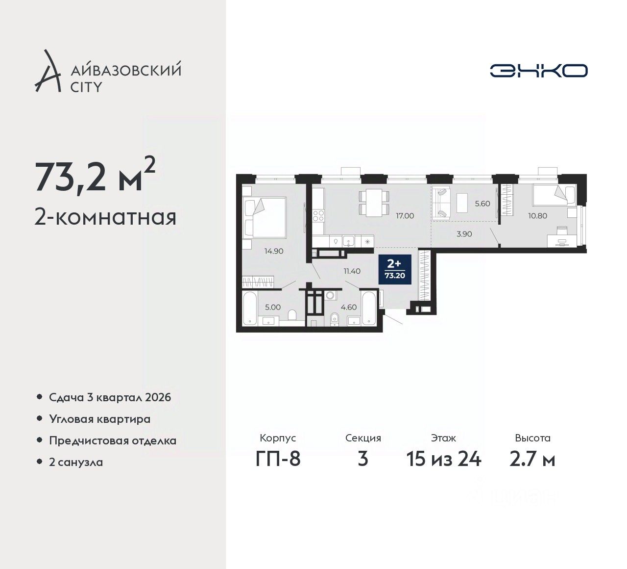 2-комн. квартира от застройщика с предчистовой отделкой в ЖК "Айвазовский City" на 15 этаже. Общая площадь: 73.2 кв.м., жилая: 32.1 кв.м., площадь просторной кухни-столовой: 21.7 кв.м. Угловая квартира, идеально подойдет любителям тишины и панорамных видов. В квартире два совмещенных санузла. Высота потолков 2.7 м.