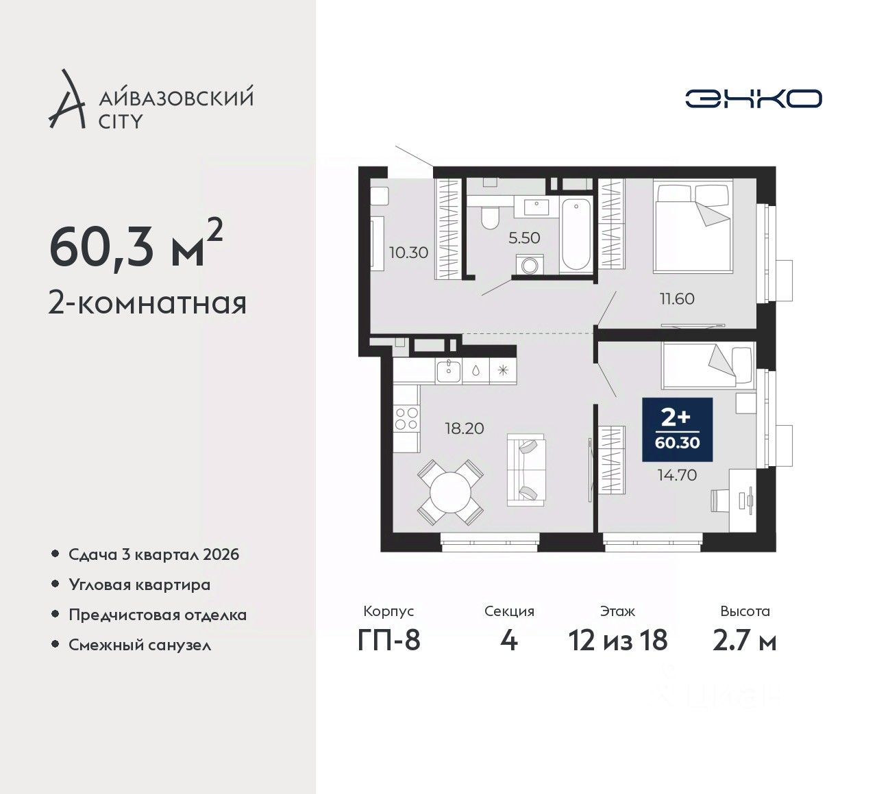 Просторная 2-комн. квартира с предчистовой отделкой в ЖК "Айвазовский City" на 12 этаже. Общая площадь: 60.3 кв.м., жилая: 26.3 кв.м., площадь просторной кухни-столовой: 18.2 кв.м. Угловая квартира, идеально подойдет любителям тишины и панорамных видов. В квартире один совмещенный санузел. Высота потолков 2.7 м.