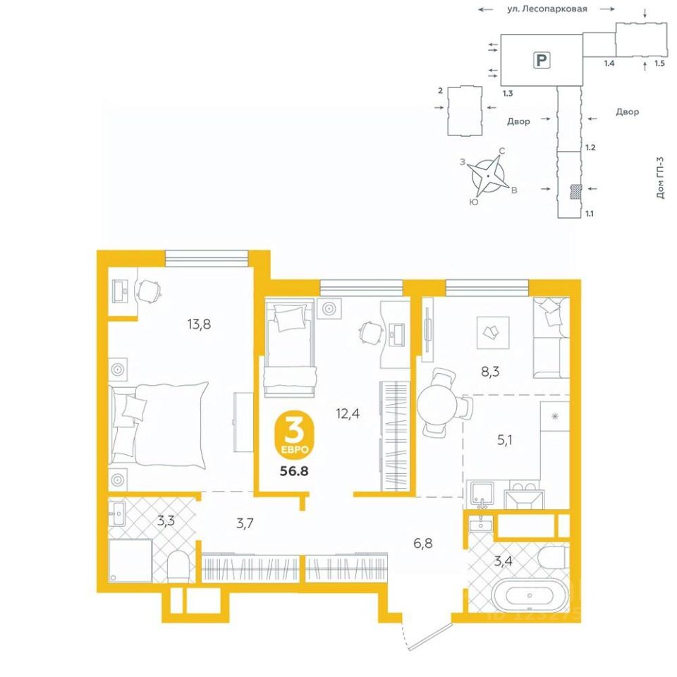 площадь квартиры - 56,8 кв.мГармоничные пропорции и большие окна наполняют пространство светом, создавая уютную атмосферу. Умное зонирование позволяет удобно организовать как рабочую, так и жилую зоны, что особенно важно для современных жителей. Санузел спроектирован с учетом всех потребностей: здесь есть ванна и место для стиральной машины. Каждый метр квартиры используется с максимальной эффективностью, что делает эту планировку отличным выбором для тех, кто ценит комфорт и удобство.