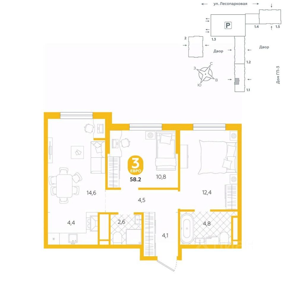 площадь квартиры - 58,2 кв.мГармоничные пропорции и большие окна наполняют пространство светом, создавая уютную атмосферу. Умное зонирование позволяет удобно организовать как рабочую, так и жилую зоны, что особенно важно для современных жителей. Санузел спроектирован с учетом всех потребностей: здесь есть ванна и место для стиральной машины. Каждый метр квартиры используется с максимальной эффективностью, что делает эту планировку отличным выбором для тех, кто ценит комфорт и удобство.