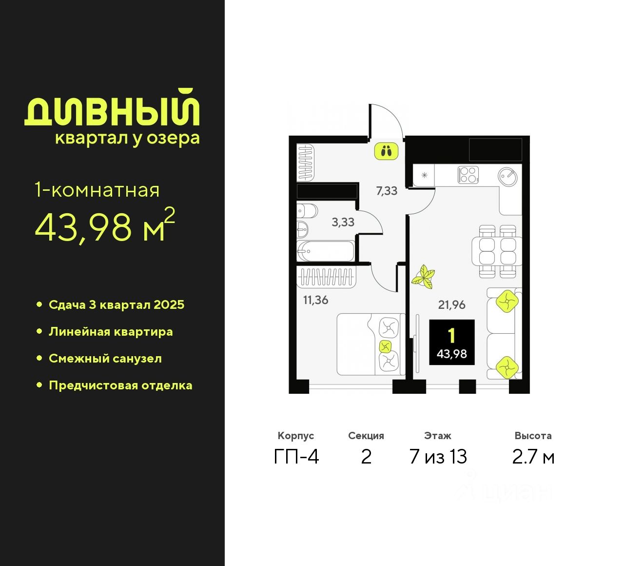 Продается 1-комн. квартира от застройщика с предчистовой отделкой в ЖК "Дивный квартал у озера" на 7 этаже. Общая площадь: 43.98 кв.м., жилая: 11.36 кв.м., площадь просторной кухни-столовой: 21.96 кв.м. Все окна выходят на одну сторону. В квартире один совмещенный санузел. Высота потолков 2.7 м.
