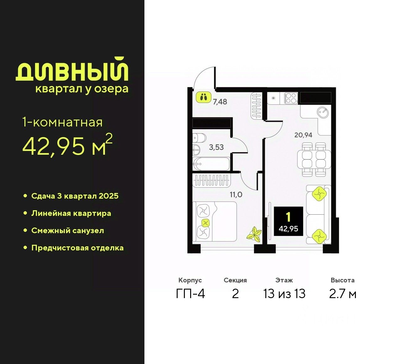 1-комн. квартира от застройщика с предчистовой отделкой в ЖК "Дивный квартал у озера" на 13 этаже. Общая площадь: 42.95 кв.м., жилая: 11 кв.м., площадь просторной кухни-столовой: 20.94 кв.м. Все окна выходят на одну сторону. В квартире один совмещенный санузел. Высота потолков 2.7 м.