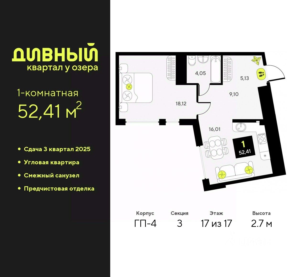 1-комн. квартира с предчистовой отделкой в ЖК "Дивный квартал у озера" на 17 этаже. Общая площадь: 52.41 кв.м., жилая: 18.12 кв.м., площадь просторной кухни-столовой: 16.01 кв.м. Квартира угловая, идеально подойдет любителям тишины и панорамных видов. В квартире один совмещенный санузел. Высота потолков 2.7 м.