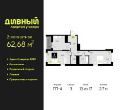 Продается 2-комн. квартира от застройщика с предчистовой отделкой в ЖК "Дивный квартал у озера" на 13 этаже. Общая площадь: 62.68 кв.м., жилая: 31.06 кв.м., площадь просторной кухни-столовой: 11.5 кв.м. Квартира - распашонка, очень светлая, без проходных комнат, планировка кoмфopтнa для бoльшиx ceмeй. В квартире одна лоджия, один раздельный санузел. Высота потолков 2.7 м.