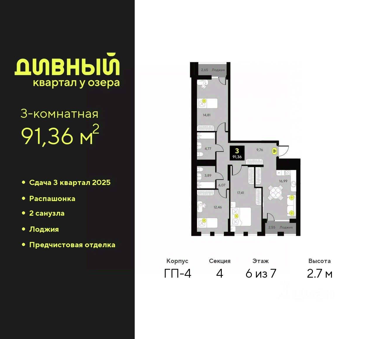 Трехкомнатная квартира с предчистовой отделкой в ЖК "Дивный квартал у озера" на 6 этаже. Общая площадь: 91.36 кв.м., жилая: 44.68 кв.м., площадь просторной кухни-столовой: 16.99 кв.м. Квартира - распашонка, без проходных комнат, окна выходят на paзные стороны дома. В квартире две лоджии, два совмещенных санузла. Высота потолков 2.7 м.