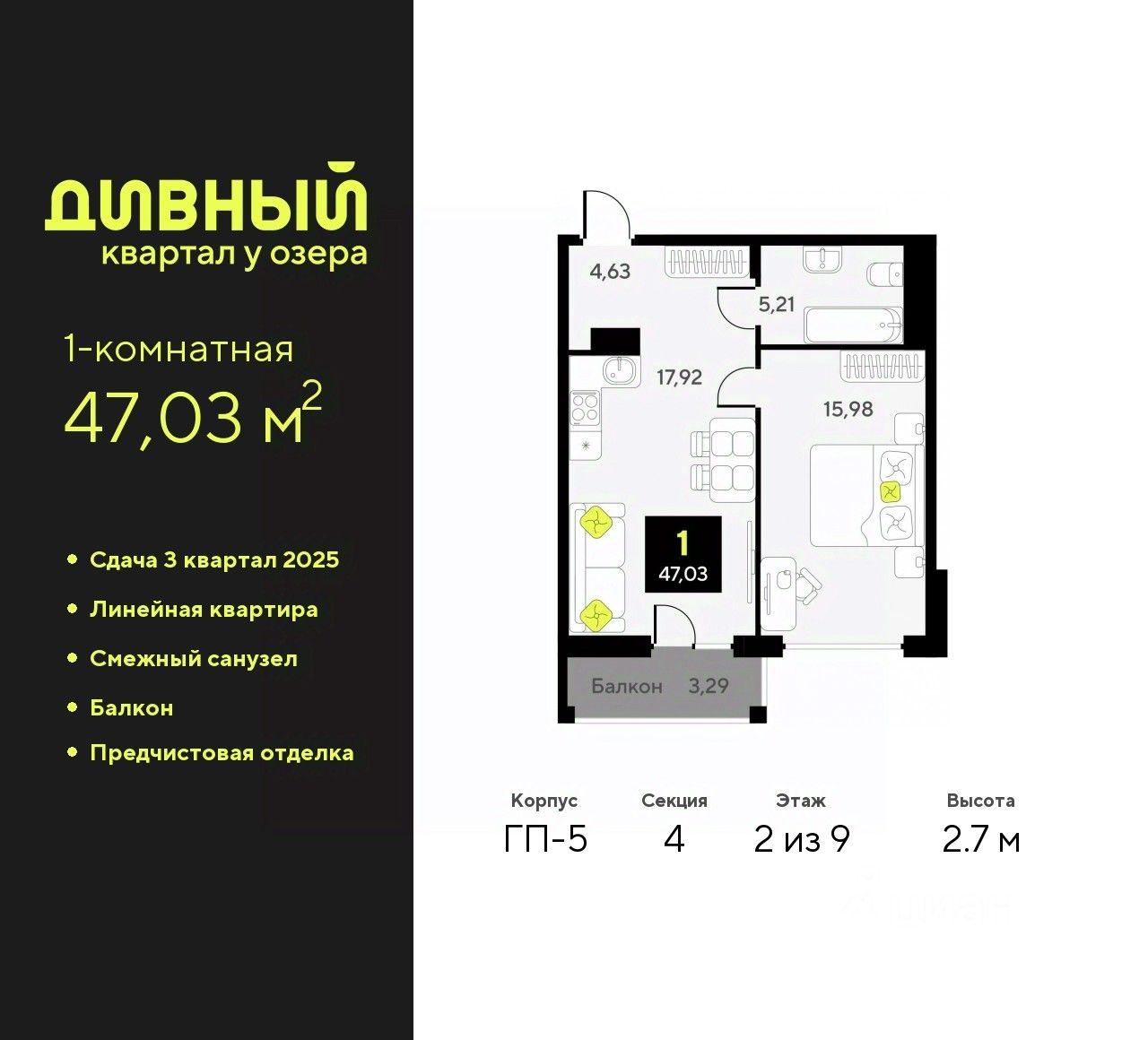 Просторная однокомнатная квартира с предчистовой отделкой в ЖК "Дивный квартал у озера" на 2 этаже. Общая площадь: 47.03 кв.м., жилая: 15.98 кв.м., площадь просторной кухни-столовой: 17.92 кв.м. Все окна выходят на одну сторону. В квартире один балкон, один совмещенный санузел. Высота потолков 2.7 м.