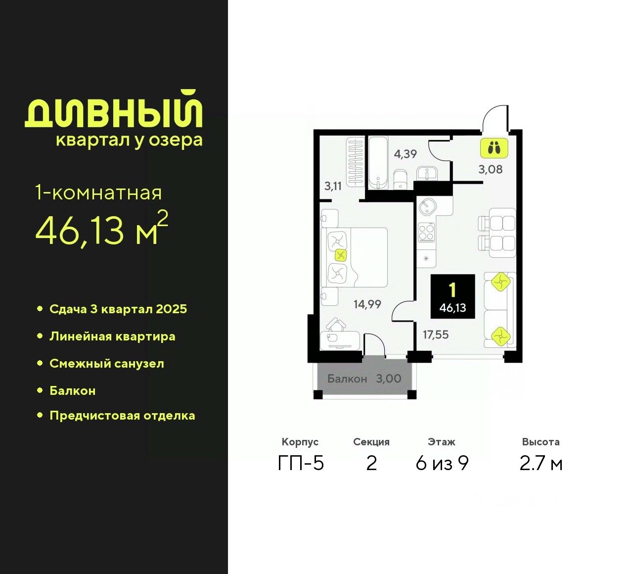 Продается 1-комн. квартира от застройщика с предчистовой отделкой в ЖК "Дивный квартал у озера" на 6 этаже. Общая площадь: 46.13 кв.м., жилая: 14.99 кв.м., площадь просторной кухни-столовой: 17.55 кв.м. Все окна выходят на одну сторону. В квартире один балкон, один совмещенный санузел. Высота потолков 2.7 м.