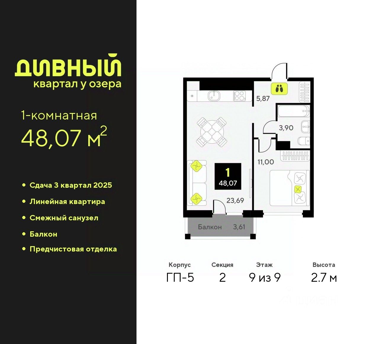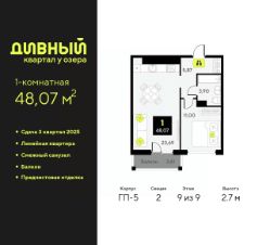 1-комн. квартира с предчистовой отделкой в ЖК "Дивный квартал у озера" на 9 этаже. Общая площадь: 48.07 кв.м., жилая: 11 кв.м., площадь просторной кухни-столовой: 23.69 кв.м. Все окна выходят на одну сторону. В квартире один балкон, один совмещенный санузел. Высота потолков 2.7 м.