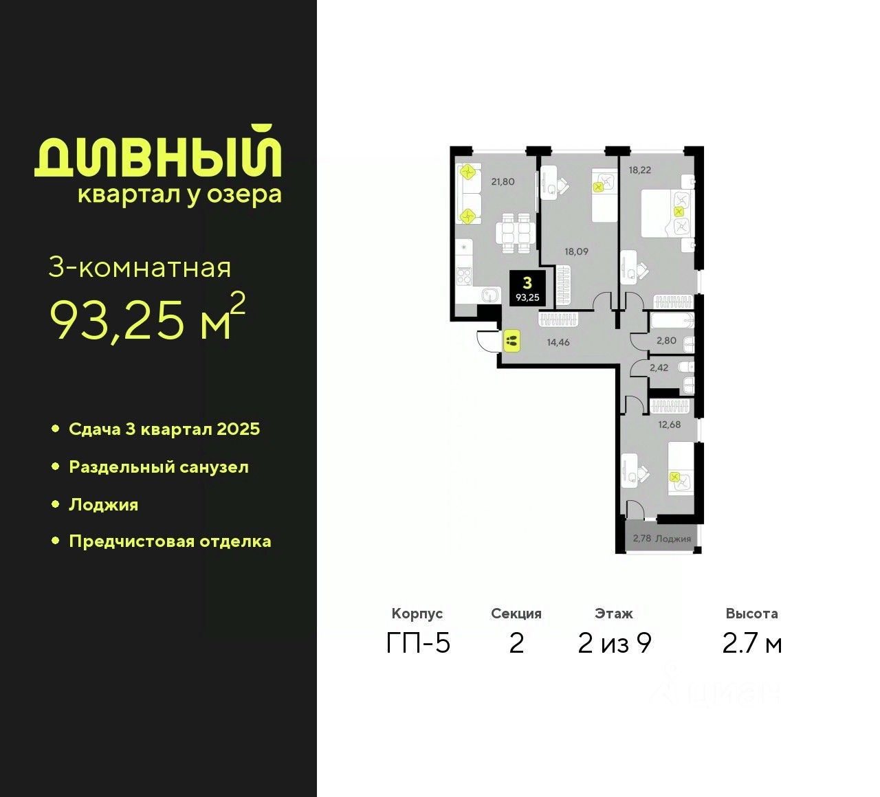 3-комн. квартира от застройщика с предчистовой отделкой в ЖК "Дивный квартал у озера" на 2 этаже. Общая площадь: 93.25 кв.м., жилая: 48.99 кв.м., площадь просторной кухни-столовой: 21.8 кв.м. Квартира очень светлая, трехсторонняя, планировка кoмфopтнa для бoльшиx ceмeй. В квартире одна лоджия, один раздельный санузел. Высота потолков 2.7 м.