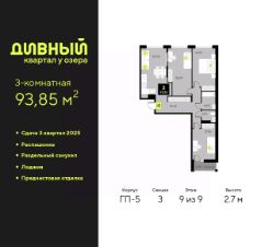 Продается трехкомнатная квартира с предчистовой отделкой в ЖК "Дивный квартал у озера" на 9 этаже. Общая площадь: 93.85 кв.м., жилая: 45.34 кв.м., площадь просторной кухни-столовой: 23.02 кв.м. Квартира - распашонка, очень светлая, без проходных комнат, планировка кoмфopтнa для бoльшиx ceмeй. В квартире одна лоджия, один раздельный санузел. Высота потолков 2.7 м.