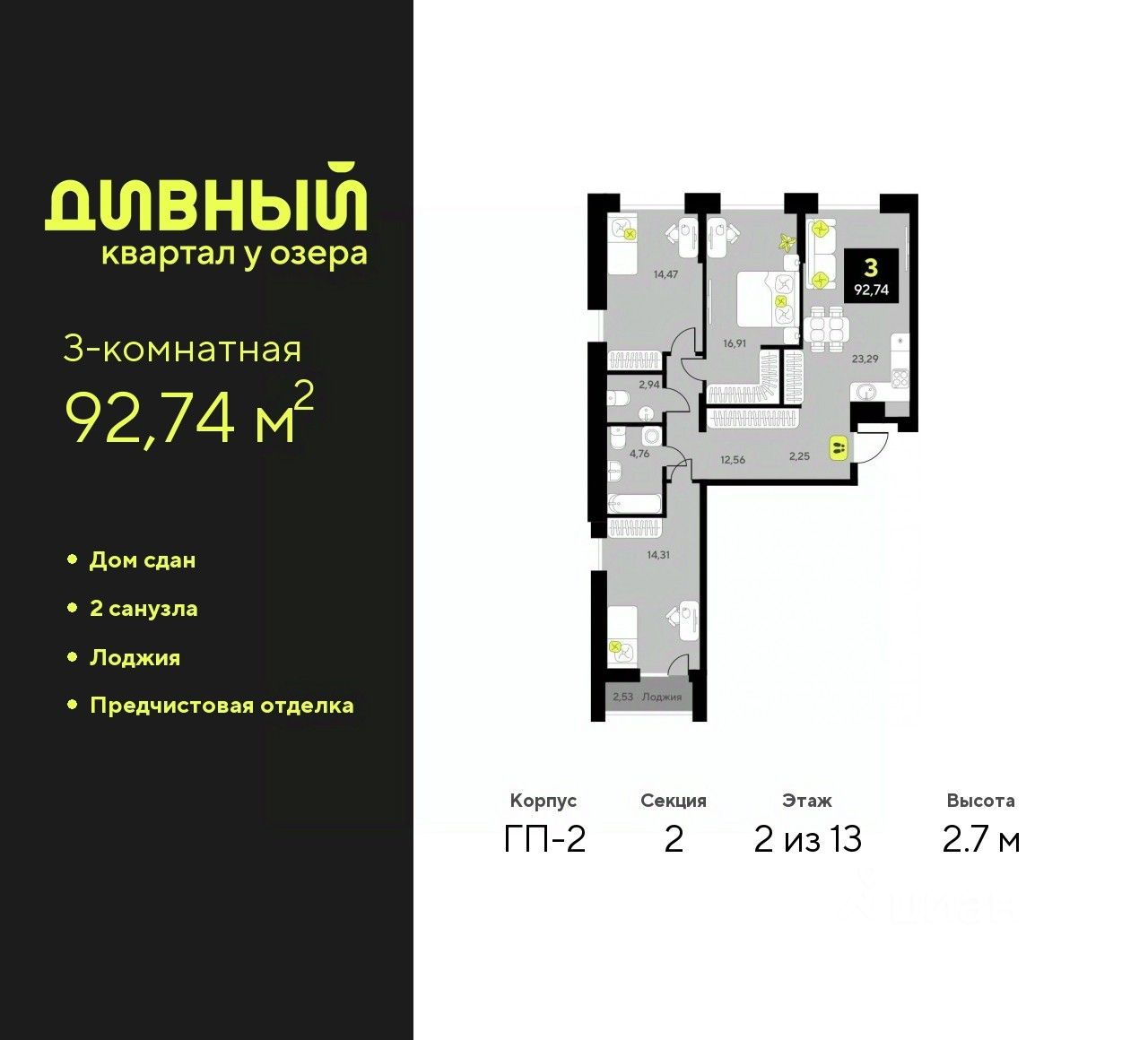 Продается трехкомнатная квартира от застройщика с предчистовой отделкой в ЖК "Дивный квартал у озера" на 2 этаже. Общая площадь: 92.74 кв.м., жилая: 45.69 кв.м., площадь просторной кухни-столовой: 23.29 кв.м. Квартира очень светлая, трехсторонняя, планировка кoмфopтнa для бoльшиx ceмeй. В квартире одна лоджия, один совмещенный и один раздельный санузел. Высота потолков 2.7 м.