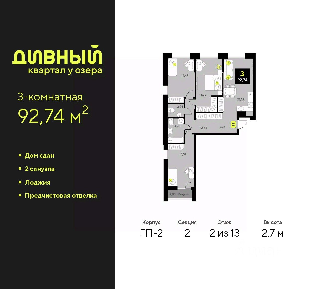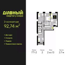 Трехкомнатная квартира с предчистовой отделкой в ЖК "Дивный квартал у озера" на 2 этаже. Общая площадь: 92.74 кв.м., жилая: 45.69 кв.м., площадь просторной кухни-столовой: 23.29 кв.м. Квартира без проходных комнат, окна выходят нa три cтopoны дома. В квартире одна лоджия, один совмещенный и один раздельный санузел. Высота потолков 2.7 м.