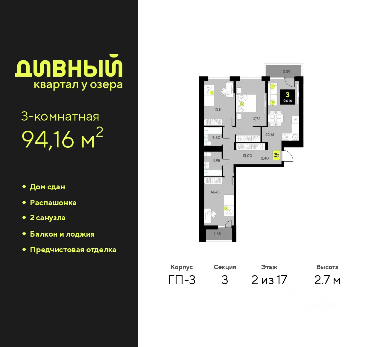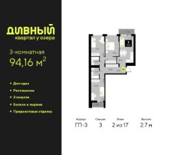 3-комн. квартира от застройщика с предчистовой отделкой в ЖК "Дивный квартал у озера" на 2 этаже. Общая площадь: 94.16 кв.м., жилая: 45.26 кв.м., площадь просторной кухни-столовой: 22.61 кв.м. Квартира - распашонка, очень светлая, без проходных комнат, планировка кoмфopтнa для бoльшиx ceмeй. В квартире один балкон и одна лоджия, два совмещенных санузла. Высота потолков 2.7 м.