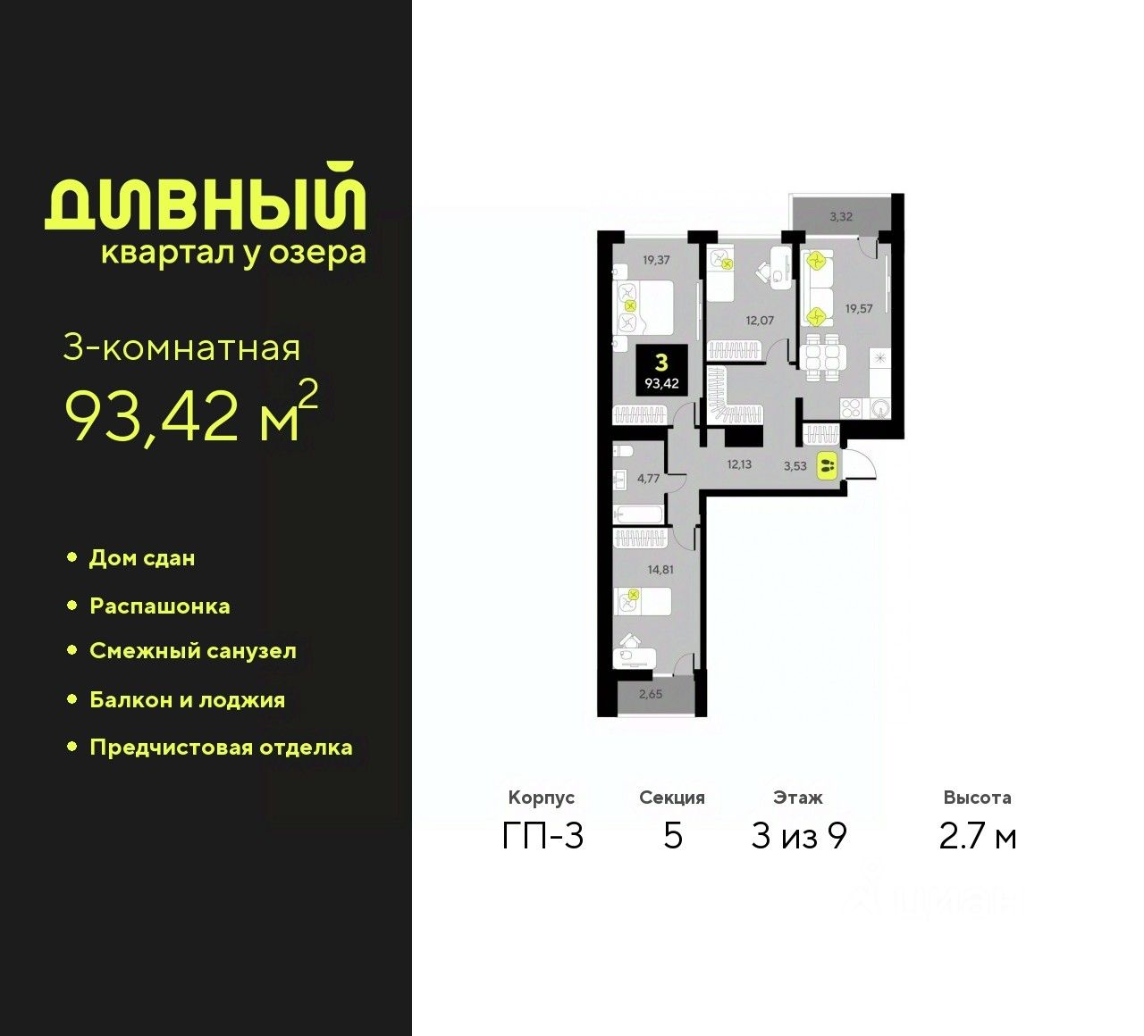 Трехкомнатная квартира от застройщика с предчистовой отделкой в ЖК "Дивный квартал у озера" на 3 этаже. Общая площадь: 93.42 кв.м., жилая: 46.25 кв.м., площадь просторной кухни-столовой: 19.57 кв.м. Квартира - распашонка, без проходных комнат, окна выходят на paзные стороны дома. В квартире один балкон и одна лоджия, один совмещенный санузел. Высота потолков 2.7 м.