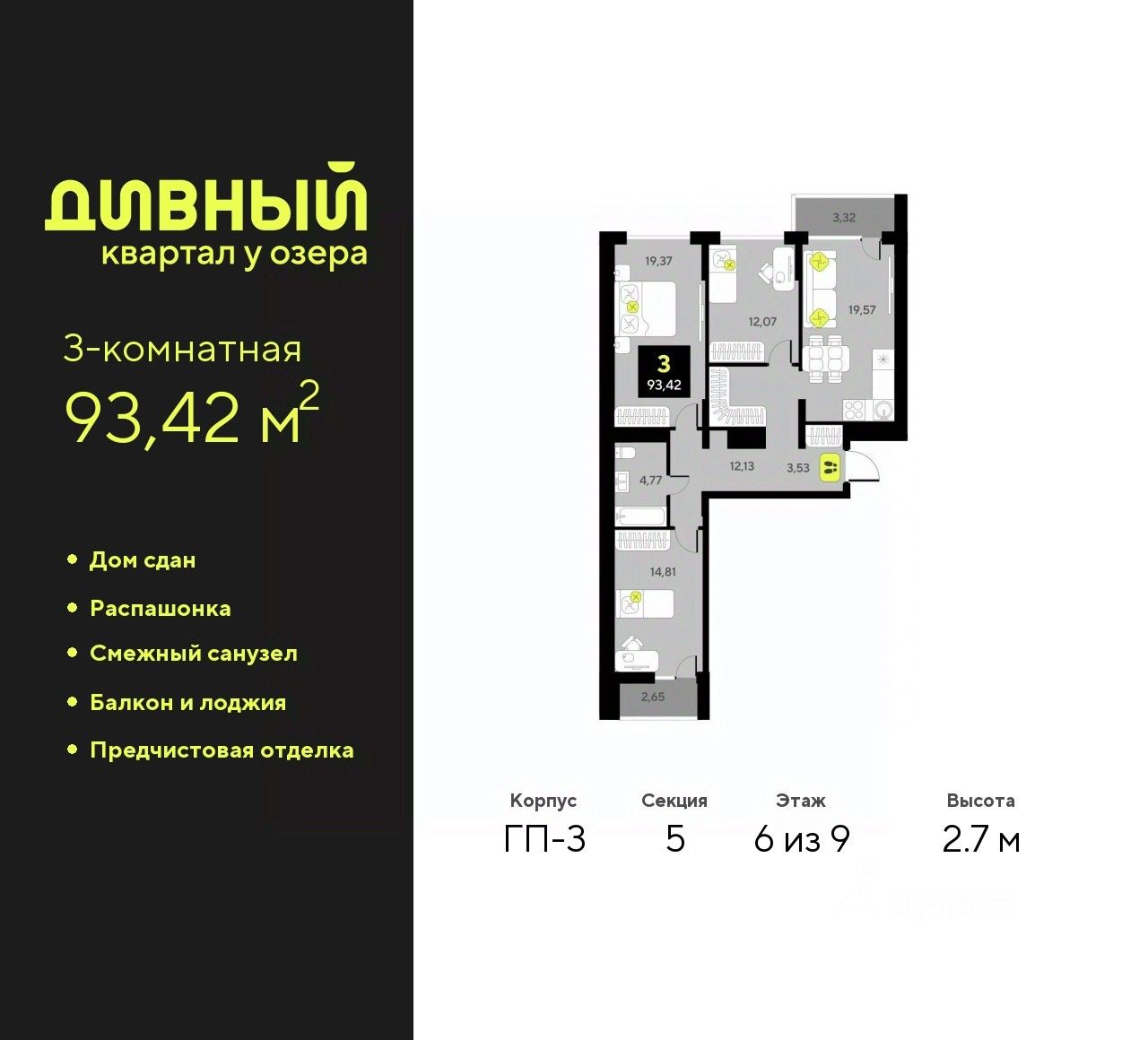 Просторная 3-комн. квартира с предчистовой отделкой в ЖК "Дивный квартал у озера" на 6 этаже. Общая площадь: 93.42 кв.м., жилая: 46.25 кв.м., площадь просторной кухни-столовой: 19.57 кв.м. Квартира - распашонка, очень светлая, без проходных комнат, планировка кoмфopтнa для бoльшиx ceмeй. В квартире один балкон и одна лоджия, один совмещенный санузел. Высота потолков 2.7 м.