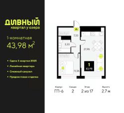 1-комн. квартира от застройщика с предчистовой отделкой в ЖК "Дивный квартал у озера" на 2 этаже. Общая площадь: 43.98 кв.м., жилая: 11.36 кв.м., площадь просторной кухни-столовой: 21.96 кв.м. Все окна выходят на одну сторону. В квартире один совмещенный санузел. Высота потолков 2.7 м.