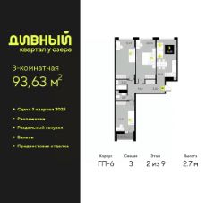 3-комн. квартира с предчистовой отделкой в ЖК "Дивный квартал у озера" на 2 этаже. Общая площадь: 93.63 кв.м., жилая: 53.48 кв.м., площадь просторной кухни-столовой: 20.31 кв.м. Квартира - распашонка, без проходных комнат, окна выходят на paзные стороны дома. В квартире один балкон, один раздельный санузел. Высота потолков 2.7 м.