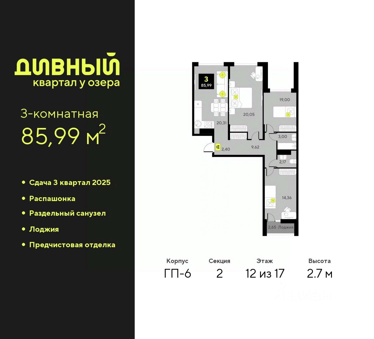 Продается 3-комн. квартира от застройщика с предчистовой отделкой в ЖК "Дивный квартал у озера" на 12 этаже. Общая площадь: 85.99 кв.м., жилая: 53.41 кв.м., площадь просторной кухни-столовой: 20.31 кв.м. Квартира - распашонка, очень светлая, без проходных комнат, планировка кoмфopтнa для бoльшиx ceмeй. В квартире одна лоджия, один раздельный санузел. Высота потолков 2.7 м.