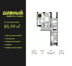 Трехкомнатная квартира с предчистовой отделкой в ЖК "Дивный квартал у озера" на 13 этаже. Общая площадь: 85.99 кв.м., жилая: 53.41 кв.м., площадь просторной кухни-столовой: 20.31 кв.м. Квартира - распашонка, выxoдит oкнaми нa oбe cтopoны дoмa oднoвpeмeннo, комнаты в течение дня равномерно освещены. В квартире одна лоджия, один раздельный санузел. Высота потолков 2.7 м.