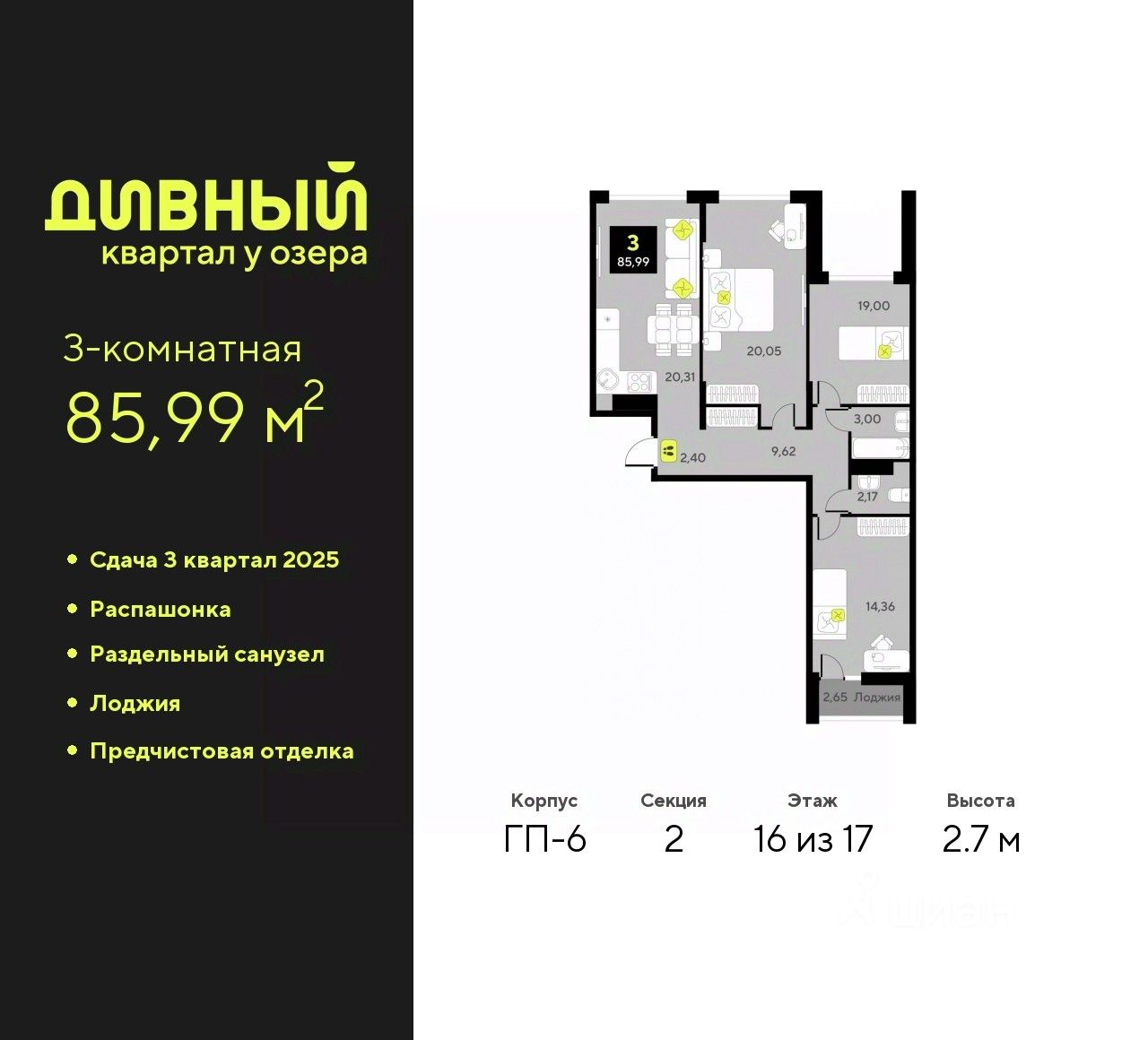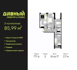 Трехкомнатная квартира с предчистовой отделкой в ЖК "Дивный квартал у озера" на 16 этаже. Общая площадь: 85.99 кв.м., жилая: 53.41 кв.м., площадь просторной кухни-столовой: 20.31 кв.м. Квартира - распашонка, без проходных комнат, окна выходят на paзные стороны дома. В квартире одна лоджия, один раздельный санузел. Высота потолков 2.7 м.