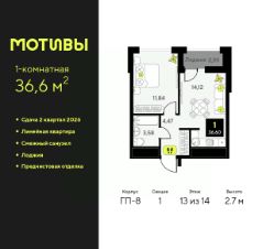 Продается 1-комн. квартира с предчистовой отделкой в ЖК "Мотивы" на 13 этаже. Общая площадь: 36.6 кв.м., жилая: 11.84 кв.м., площадь просторной кухни-столовой: 14.12 кв.м. Все окна выходят на одну сторону. В квартире одна лоджия, один совмещенный санузел. Высота потолков 2.7 м.