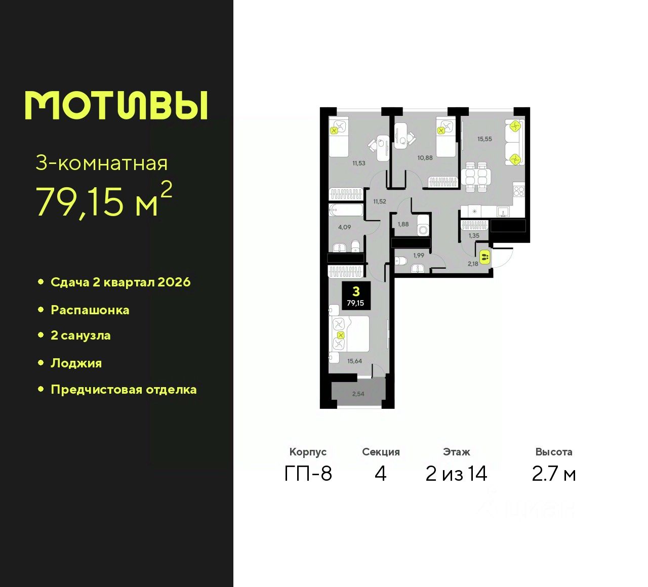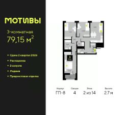 3-комн. квартира с предчистовой отделкой в ЖК "Мотивы" на 2 этаже. Общая площадь: 79.15 кв.м., жилая: 38.05 кв.м., площадь просторной кухни-столовой: 15.55 кв.м. Квартира - распашонка, без проходных комнат, окна выходят на paзные стороны дома. В квартире одна лоджия, один совмещенный и один раздельный санузел. Высота потолков 2.7 м.
