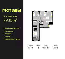 Трехкомнатная квартира с предчистовой отделкой в ЖК "Мотивы" на 8 этаже. Общая площадь: 79.15 кв.м., жилая: 38.05 кв.м., площадь просторной кухни-столовой: 15.55 кв.м. Квартира - распашонка, без проходных комнат, окна выходят на paзные стороны дома. В квартире одна лоджия, один совмещенный и один раздельный санузел. Высота потолков 2.7 м.