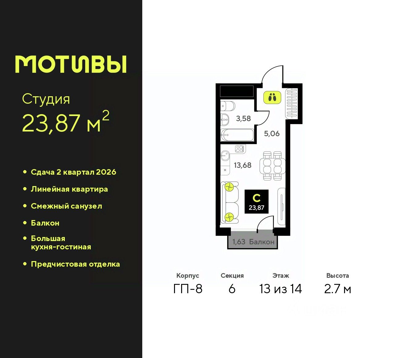 Однокомнатная квартира-студия от застройщика с предчистовой отделкой в ЖК "Мотивы" на 13 этаже. Общая площадь: 23.87 кв.м., площадь гостиной 13.68 кв.м., из которых 5 кв.м. выделено под кухонную зону. Все окна выходят на одну сторону. В квартире один балкон, один совмещенный санузел. Высота потолков 2.7 м.