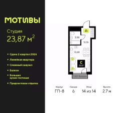 1-комн. квартира-студия от застройщика с предчистовой отделкой в ЖК "Мотивы" на 14 этаже. Общая площадь: 23.87 кв.м., площадь гостиной 13.68 кв.м., из которых 5 кв.м. выделено под кухонную зону. Все окна выходят на одну сторону. В квартире один балкон, один совмещенный санузел. Высота потолков 2.7 м.