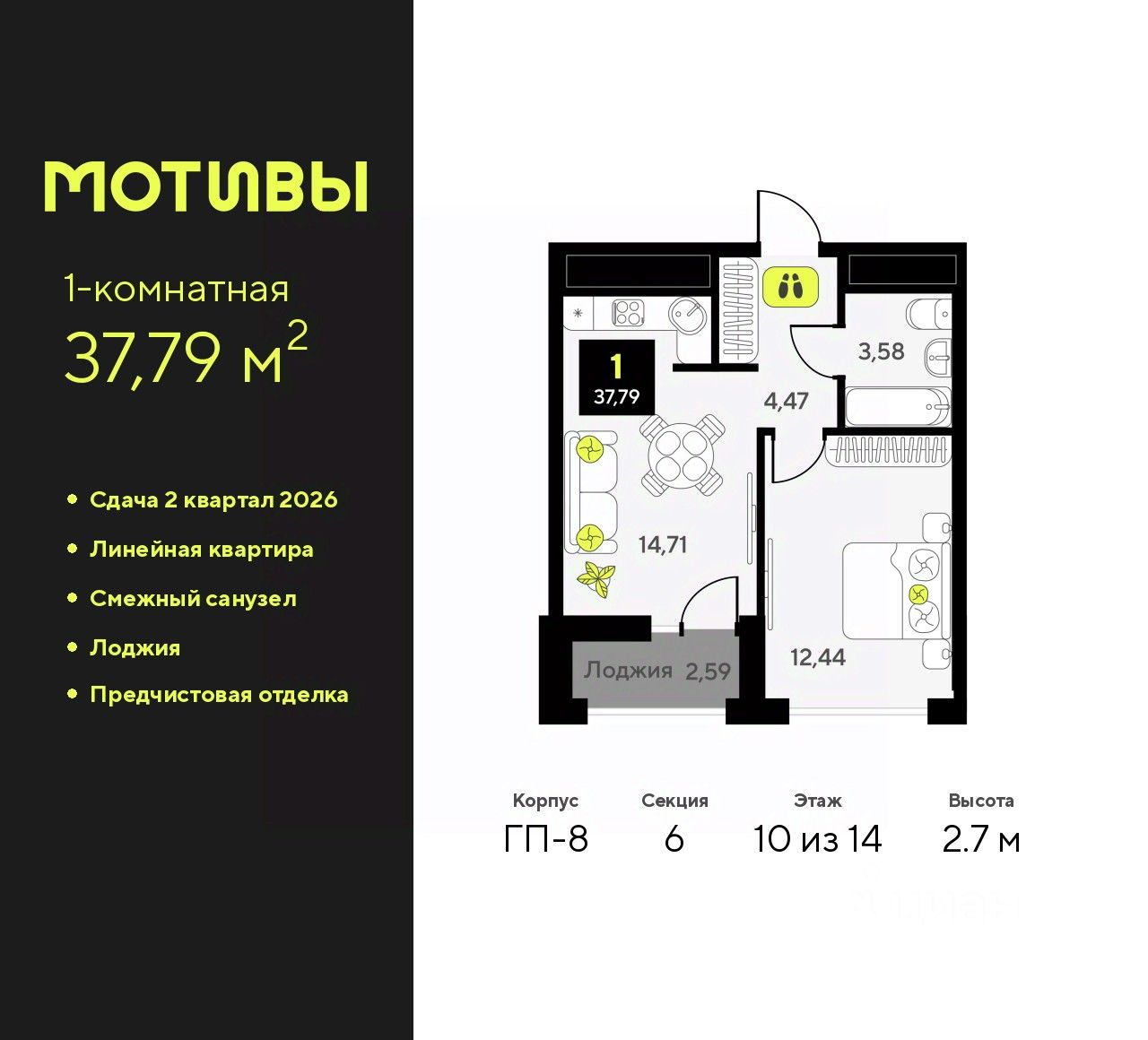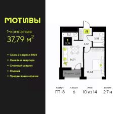 Просторная 1-комн. квартира с предчистовой отделкой в ЖК "Мотивы" на 10 этаже. Общая площадь: 37.79 кв.м., жилая: 12.44 кв.м., площадь просторной кухни-столовой: 14.71 кв.м. Все окна выходят на одну сторону. В квартире одна лоджия, один совмещенный санузел. Высота потолков 2.7 м.