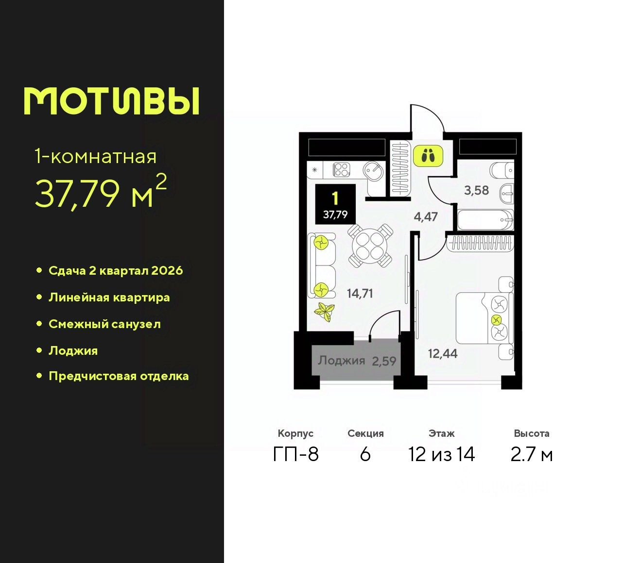 Продается 1-комн. квартира от застройщика с предчистовой отделкой в ЖК "Мотивы" на 12 этаже. Общая площадь: 37.79 кв.м., жилая: 12.44 кв.м., площадь просторной кухни-столовой: 14.71 кв.м. Все окна выходят на одну сторону. В квартире одна лоджия, один совмещенный санузел. Высота потолков 2.7 м.