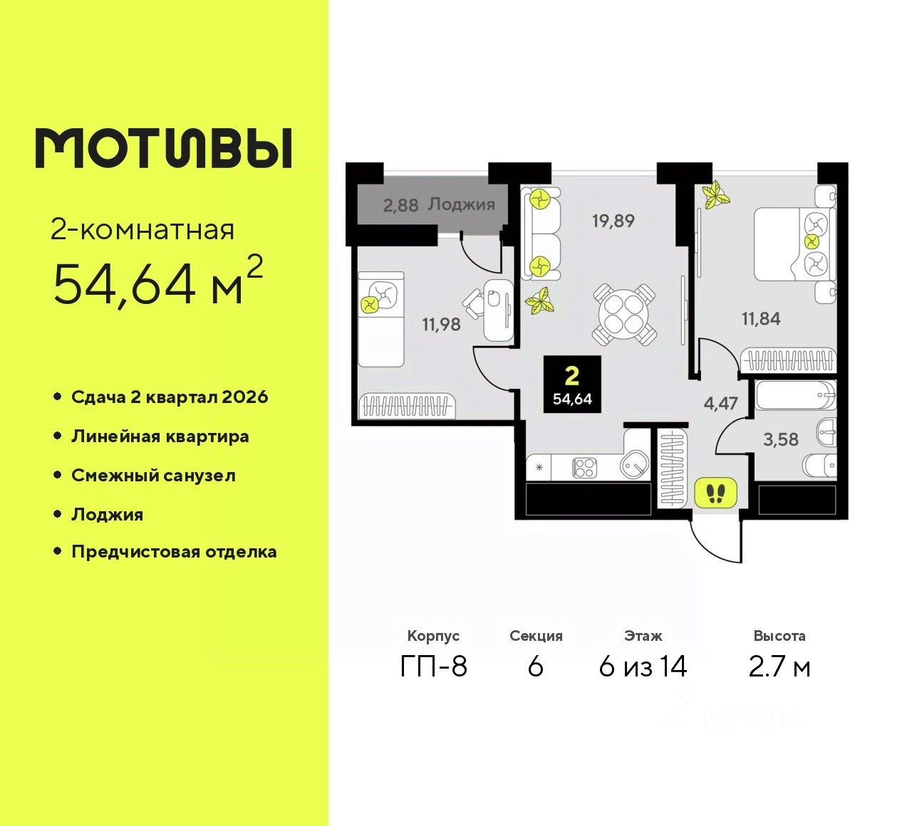 Продается 2-комн. квартира от застройщика с предчистовой отделкой в ЖК "Мотивы" на 6 этаже. Общая площадь: 54.64 кв.м., жилая: 23.82 кв.м., площадь просторной кухни-столовой: 19.89 кв.м. Комнаты изолированные, все окна выходят на одну сторону. В квартире одна лоджия, один совмещенный санузел. Высота потолков 2.7 м.