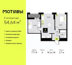 Двухкомнатная квартира от застройщика с предчистовой отделкой в ЖК "Мотивы" на 14 этаже. Общая площадь: 54.64 кв.м., жилая: 23.82 кв.м., площадь просторной кухни-столовой: 19.89 кв.м. Комнаты изолированные, все окна выходят на одну сторону. В квартире одна лоджия, один совмещенный санузел. Высота потолков 2.7 м.
