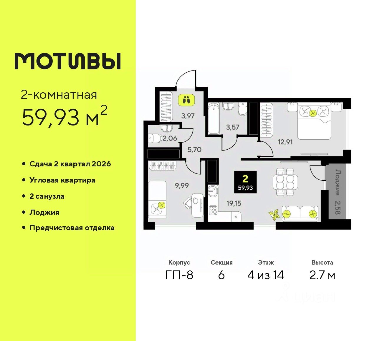 2-комн. квартира от застройщика с предчистовой отделкой в ЖК "Мотивы" на 4 этаже. Общая площадь: 59.93 кв.м., жилая: 22.9 кв.м., площадь просторной кухни-столовой: 19.15 кв.м. Квартира угловая, очень светлая, естественная вентиляция при открытии окон. В квартире одна лоджия, один совмещенный и один раздельный санузел. Высота потолков 2.7 м.