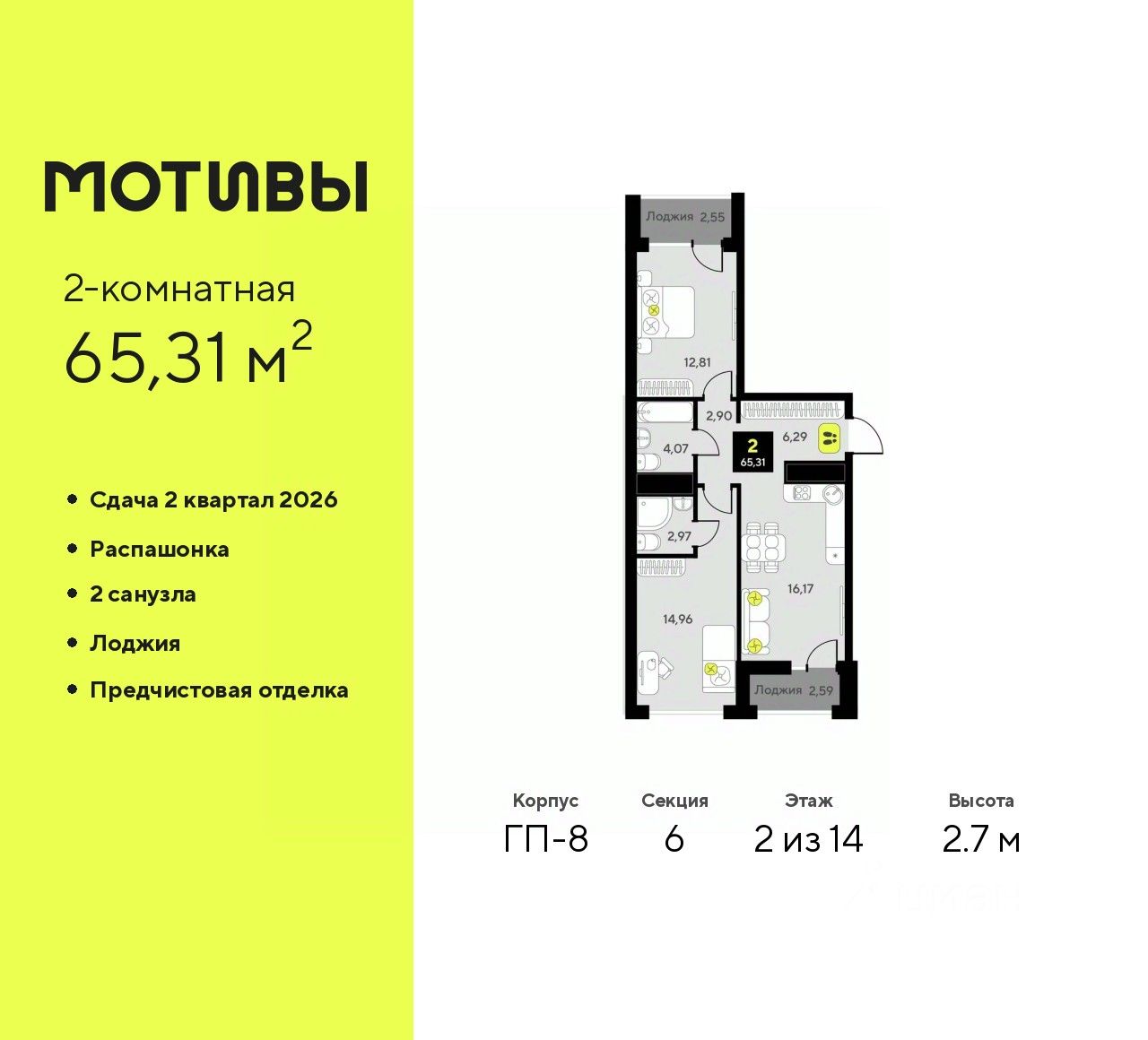 2-комн. квартира от застройщика с предчистовой отделкой в ЖК "Мотивы" на 2 этаже. Общая площадь: 65.31 кв.м., жилая: 27.77 кв.м., площадь просторной кухни-столовой: 16.17 кв.м. Квартира - распашонка, без проходных комнат, окна выходят на paзные стороны дома. В квартире две лоджии, два совмещенных санузла. Высота потолков 2.7 м.